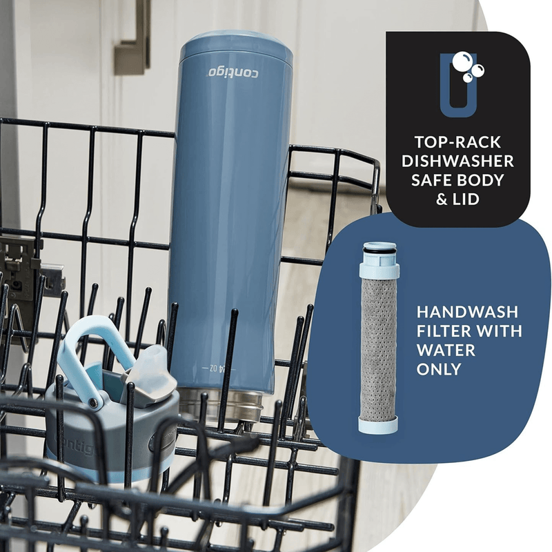 Enjoy clean, refreshing water wherever you go with this smartly designed Contigo Wells 24oz Stainless Steel filtered bottle, featuring a long-lasting filter that works for up to 3-5 months or 60 gallons and replaces hundreds of single-use plastic bottles. The durable stainless steel body keeps your drinks cold all day, while advanced carbon fiber filter technology reduces up to 99% of chlorine taste and odor for noticeably better flavor. An angled straw and pop-up spout make sipping easy down to the last drop, then seal securely to prevent spills, with a button lock for extra peace of mind. Built to fit most car cup holders, it also includes a covered spout to protect against dirt and grime, an integrated carry handle for one-handed convenience, and dishwasher-safe lid and body for easy cleanup, with the filter simply rinsing clean under water.