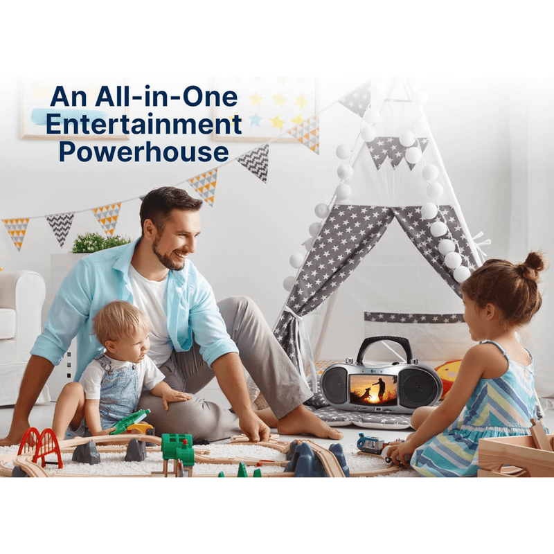 Discover the ultimate entertainment experience with our all-in-one DVD boombox, featuring a built-in 7" LCD screen perfect for enjoying DVD movies on the go. With Bluetooth wireless technology, you can stream your favorite tunes effortlessly or use HD input to connect and play digital media from compatible sources. This versatile device also includes a CD player that supports MP3 files and an AM/FM radio, ensuring you're always in tune with your favorite music or stations. Plus, it doubles as a digital media player, seamlessly playing content from USB drives and SD cards. Immerse yourself in rich, dynamic sound with the powerful full-range drivers in the twin speakers, and enjoy a range of connectivity options, including composite A/V output, a headphone jack, 3.5mm aux input, and a microphone input for all your entertainment needs. Compact, multifunctional, and designed for audio-visual enthusiasts, this boombox is your perfect companion for indoor relaxation and outdoor adventures.