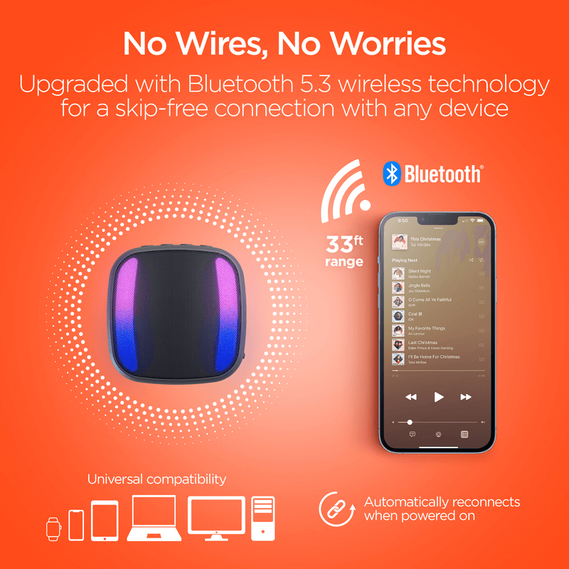Light up your ride with the Spin Cycle LED Wireless Handlebar Speaker from HyperGear. This powerful little speaker securely mounts to your bike's handlebar so you can bring HD music and a colorful LED light show wherever the road takes you - and it's rated IPX4 splashproof and water-resistant, so you don't need to worry about getting caught in the rain. Thanks to the speaker's built-in clip grip and the mount's grab and go detachable design, you can easily take the speaker with you indoors at the end of the day, or clip it onto a backpack for even more adventures. Enjoy up to 8 hours of on-the-go playtime, and stream all your music stutter-free with the latest Bluetooth technology.
