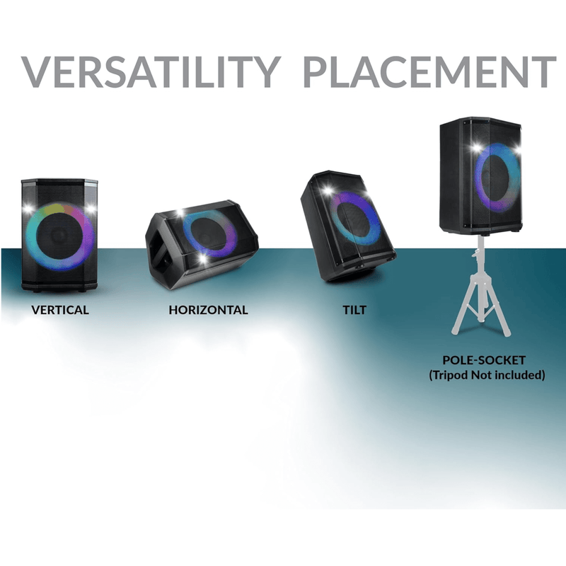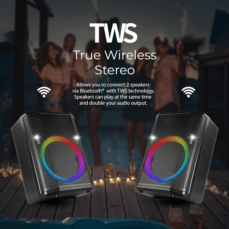 Turn up the energy with this IQ Sound 15" Portable Bluetooth Speaker that boasts tiltable audio enhancement and that's designed to deliver powerful, dynamic sound that transforms any space into an audio experience. Built for durability and portability, it's perfect for home entertainment, seminars, parties, or any event where reliable sound matters. With Bluetooth 5.0 and True Wireless Stereo (TWS) technology, you can pair two speakers for double the output and an immersive surround sound effect, while colorful LED lights pulse to the beat for a dazzling light show. Offering versatile playback options through Bluetooth, Micro SD, USB, AUX, FM radio, and microphone inputs, this all-in-one system keeps the music flowing. Complete with a rechargeable battery providing up to 6 hours of playtime, this speaker is ready to keep the party going wherever you are.