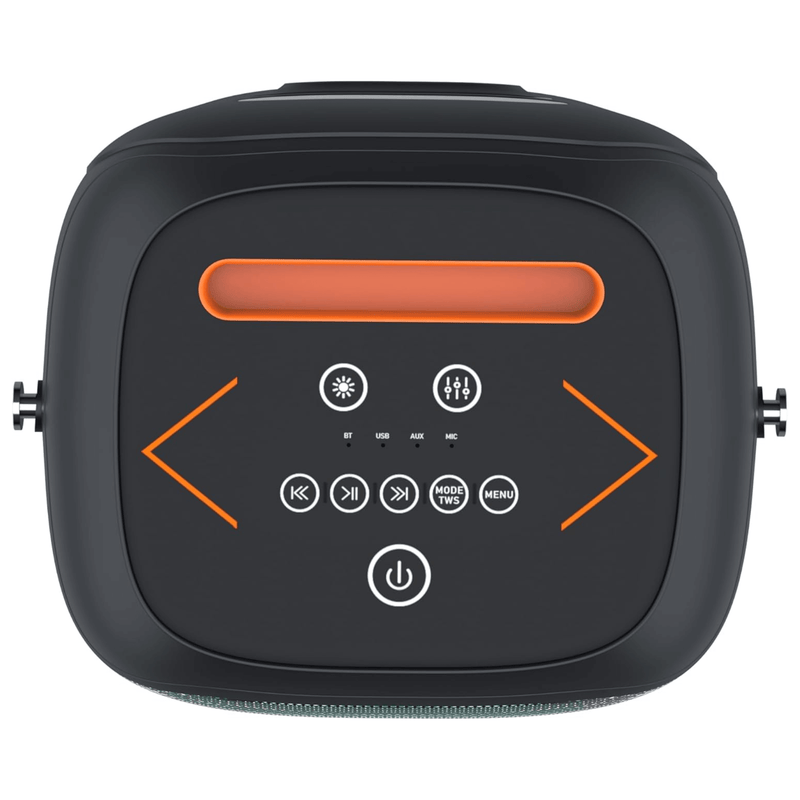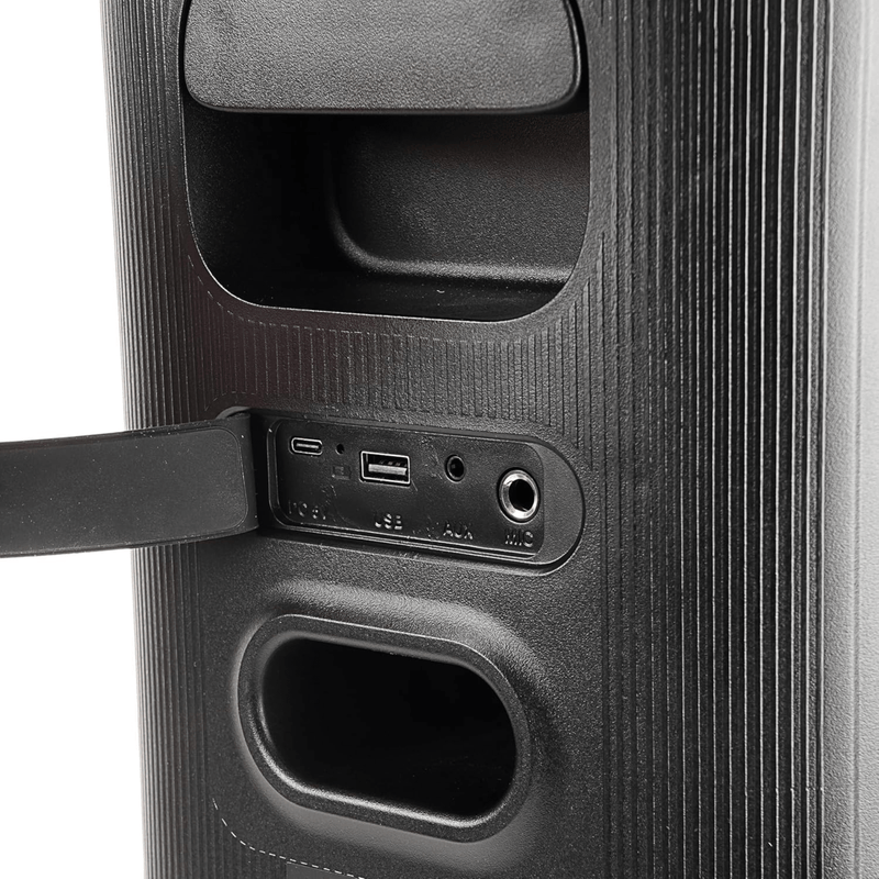 This versatile IQ Sound Fusion Glow Speaker System features dual 5" high-efficiency woofers and a 1.5" tweeter, delivering 50W RMS of powerful, balanced sound with a wide 50Hz-20KHz frequency response, 4Ohm impedance, and an 85dB signal-to-noise ratio. Perfect for home entertainment, seminars, parties, and events, it offers built-in Bluetooth for seamless wireless streaming, along with True Wireless Stereo (TWS) technology that lets you connect two speakers for double the audio output. The system includes multiple input options - USB, AUX, Mic (with rubber dust cover), and FM radio - plus a built-in phone/tablet holder for added convenience. Colorful LED lights enhance the atmosphere, while the wireless microphone makes karaoke or announcements easy. Designed for portability, it has a built-in carry handle, a rechargeable 3600mAh battery providing around 4 hours of playtime at 10% volume, and recharges quickly with the included USB-C cable. Accessories include a 96cm USB-C charging cable, wireless mic, and user manual, making this an all-in-one solution for dynamic, high-quality sound wherever you go.