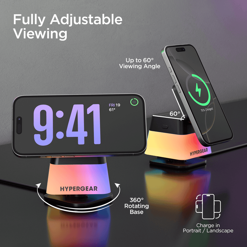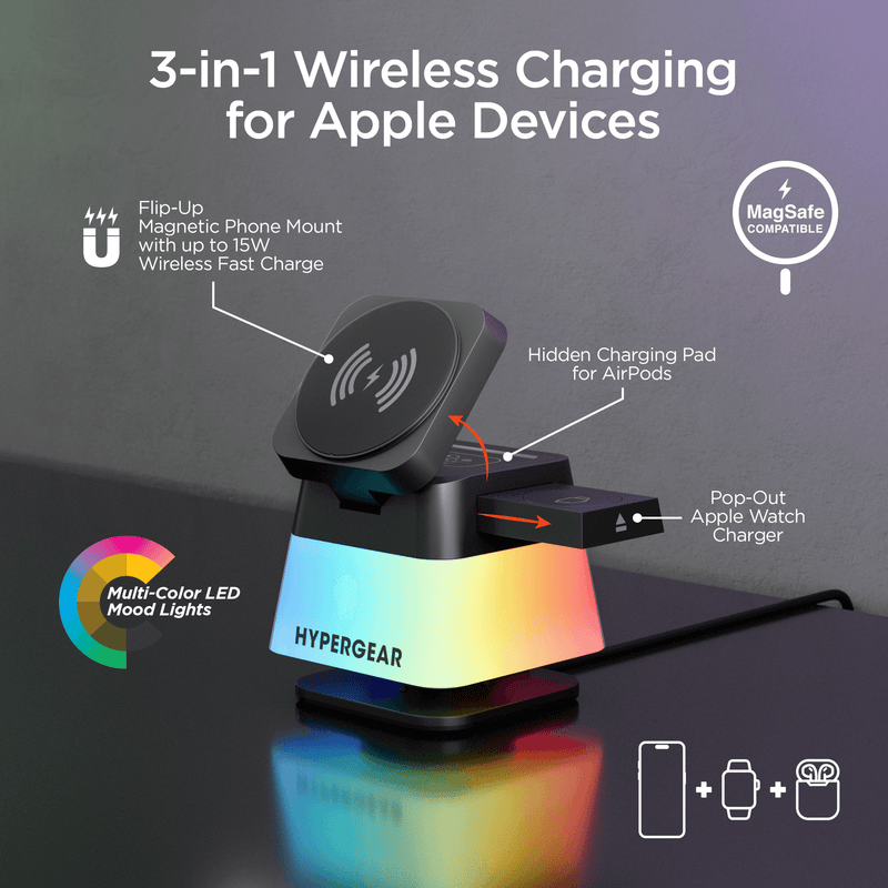 Power up in 3D with the PowerFold Cube 3-in-1 Wireless Charging Stand. Flip up the 15W magnetic charging surface, snap on your MagSafe-enabled phone, and enjoy fast, reliable wireless power with seamless alignment for a safer, cooler, and more efficient charge. A pop-out watch dock and hidden charging pad keep your Apple Watch and AirPods powered up without the clutter. The stand adjusts up to 60-degree and rotates a full 360-degree so you always get the perfect screen view in portrait or landscape, while multi-color LED lights let you set the mood with either a soft warm glow or a vibrant rainbow effect. Set it up on your desk or bedside table, or take it with you on the go - with its foldable design and space-saving cube shape, it's as travel-ready as it is versatile.