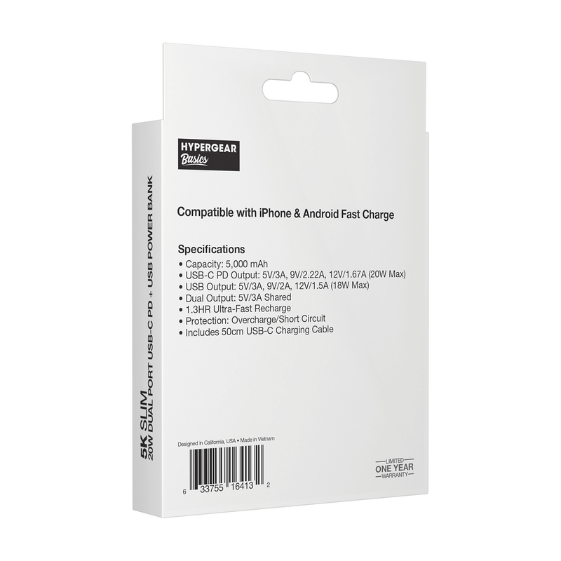 Add a full day of power to your phone and top up anywhere you go with the 5K Slim Power Bank from HyperGear. Featuring a 20W USB-C Power Delivery port and an 18W USB Adaptive Fast Charge port, you can plug in with any cable that fits your phone and fast charge from 0 to 50% to in as little as 30 minutes! Made to fit right in your pocket, it's so small and lightweight it can even share the space with your wallet or keys. The 5,000mAh capacity is enough to provide a full 100% recharge for most phones - it's like carrying an extra battery to swap in when you’re running low.