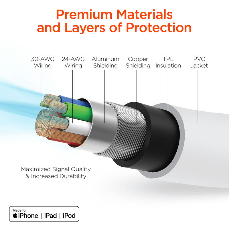 Charge and Sync at maximum speed. Engineered with industrial-strength PVC, this cable delivers the flexibility you need to reliably charge and sync your devices. Featuring reinforced stress points and thick gauge wiring, this ultra-durable cable has been proven to last 5X longer than standard cables. Built with Apple's new, upgraded C89 Lightning connector and smart chip. Apple's new C89 connector improves on Apple's previous C48 connector by adding more durability, more reliable, faster charging, and built-in protection from overheating and overcharging, ensuring the safety of your Apple device and cable. Opens quickly and is in easy resalable condition. There are no excess packaging materials, such as hard plastic clamshell casings, padding, or plastic bindings that would require a box cutter or knife. Ideal wholesale buy for small stores!