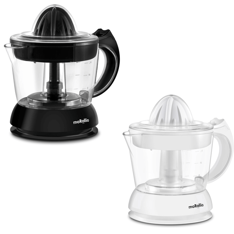 Enjoy fresh, flavorful citrus juice at home with the moRollio Compact 24 oz Citrus Juicer, designed for ease, efficiency, and everyday convenience. This electric juicer includes two cone sizes to handle both large and small citrus fruits, making it simple to extract juice from oranges, grapefruits, lemons, and limes with a quick press. The automatic cone-reversing motion helps maximize juice extraction, while the clear 24 oz pitcher features easy-to-read measurement markings and an adjustable pulp control sifter so you can customize every glass. Compact and countertop-friendly, the juicer stays securely in place thanks to non-slip feet, and the power cord wraps neatly around the base for tidy storage, making fresh, nutritious juice effortless anytime you want it.